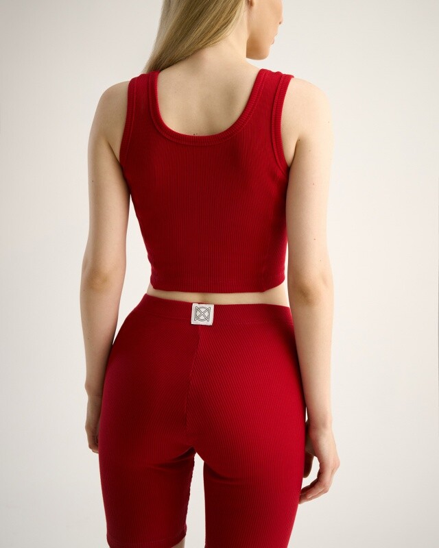 Майка из кашкорсе, облегающая с отстроченными рельефами. Горловина и проймы окантованы основной тканью