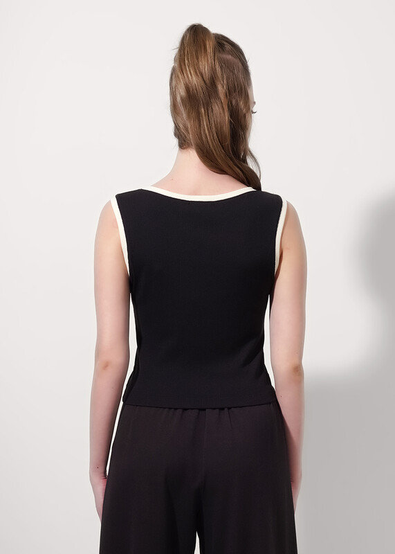Майка из трикотажного полотна кашкорсе. Средняя ширина плеча. Округлая горловина. По горловине и пройме контрастная обтачка.