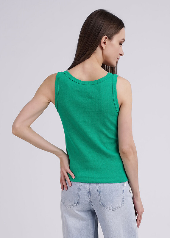 Майка из хлопкового трикотажного полотна рибана. Умеренный объем. Широкая бретель, округлая горловина. По горловине и пройме окантовка.