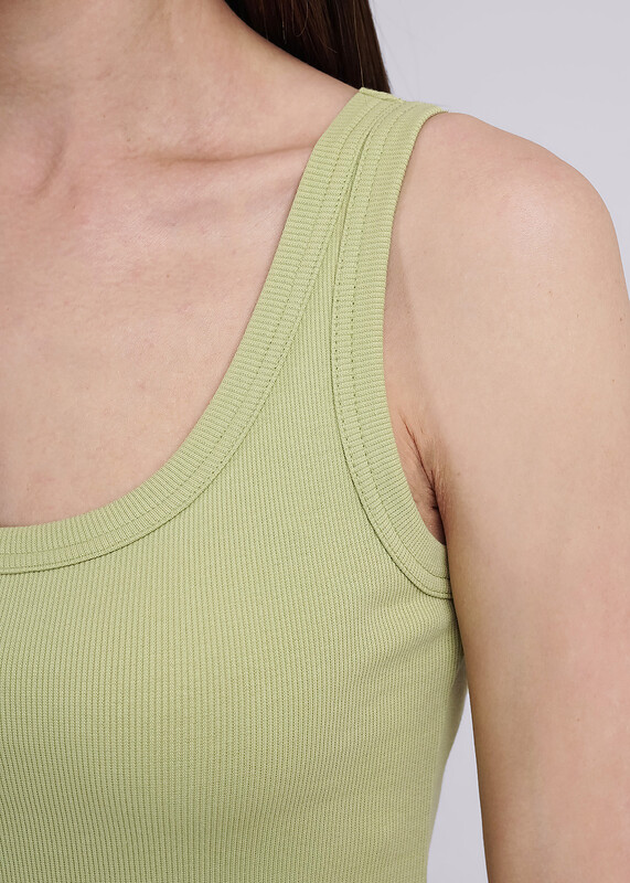 Майка из хлопкового трикотажного полотна рибана. Умеренный объем. Широкая бретель, округлая горловина. По горловине и пройме окантовка.