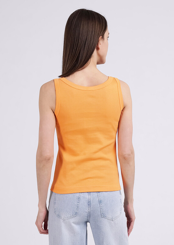 Майка из хлопкового трикотажного полотна рибана. Умеренный объем. Широкая бретель, округлая горловина. По горловине и пройме окантовка.