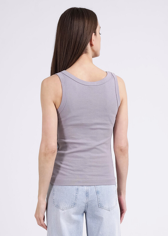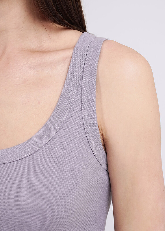 Майка из хлопкового трикотажного полотна рибана. Умеренный объем. Широкая бретель, округлая горловина. По горловине и пройме окантовка.