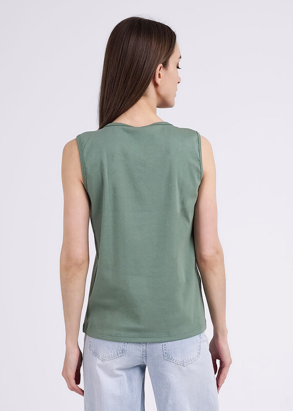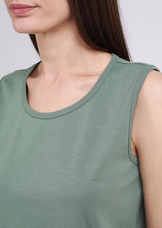 Майка из трикотажного полотна - рибана. Умеренный объем. Широкая бретель,округлая горловина. По пройме и горловине окантовка.
