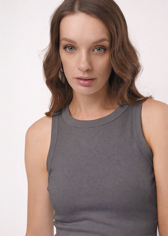 Майка из трикотажного полотна - рибана. Умеренный объем. Широкая бретель,округлая горловина. По пройме и горловине окантовка.