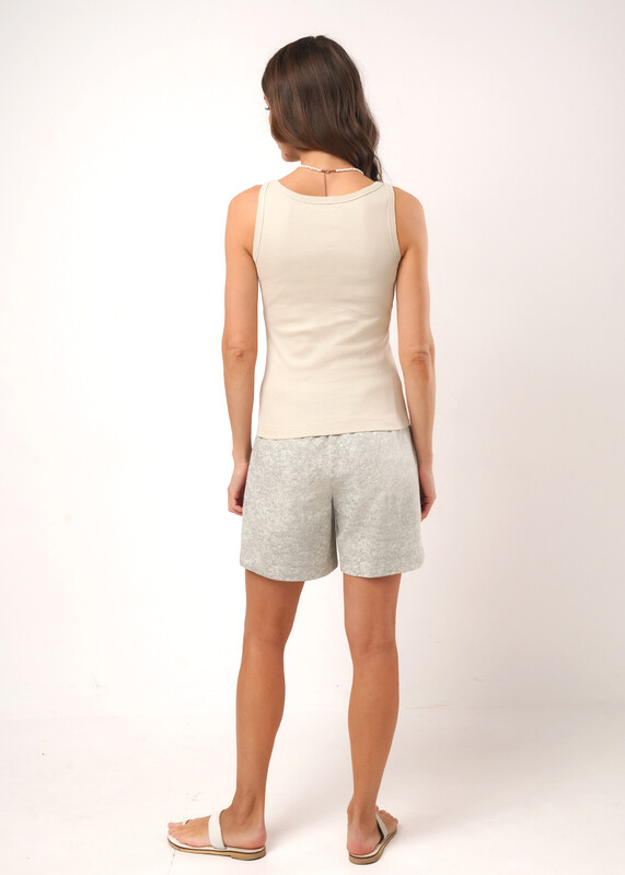 Майка из эластичного трикотажного полотна рибана по фигуре на широких бретелях. Круглый вырез горловины.