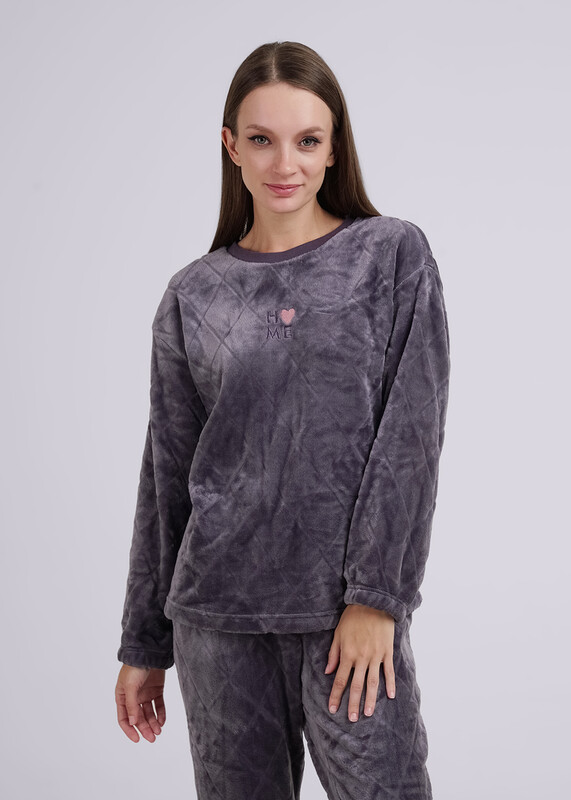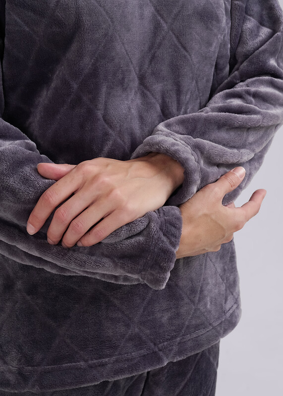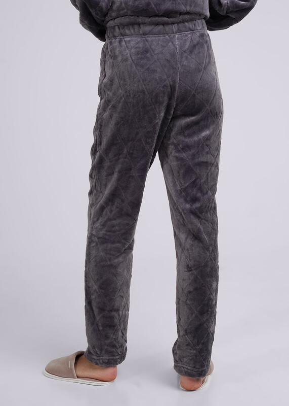 Женский костюм из фактурного велсофта, состоящий из джемпера и брюк. Джемпер прямого силуэта с горловиной, обработанной кашкорсе, рукавами полной длины, по низу рукавов резинка. Брюки прямые, с поясом на резинке.