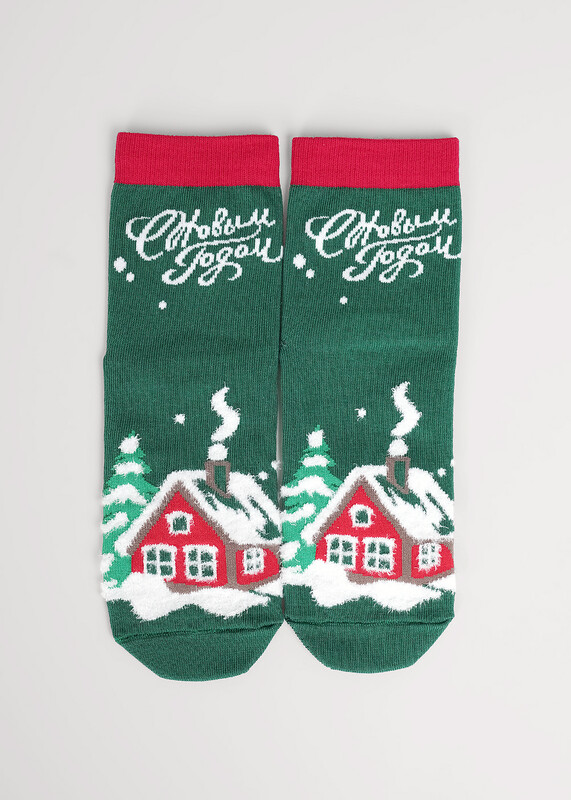 Носки детские с рисунком дом в зимнем лесу, снег выполнен из пряжи травка, и надписью С Новым годом!