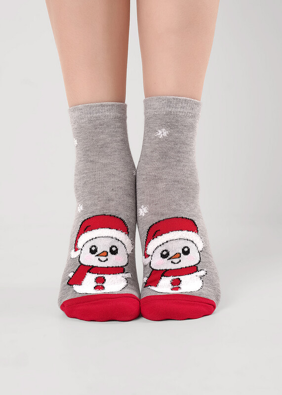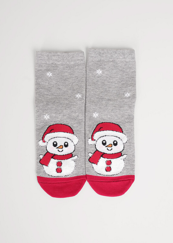 Детские носки с выделенным мысом и пяткой с рисунком снеговика, тело снеговика и отворот колпака выполнены из пряжи травка