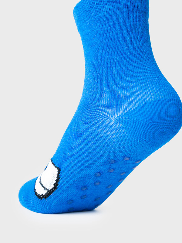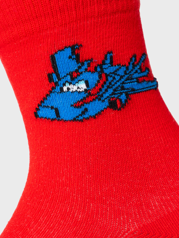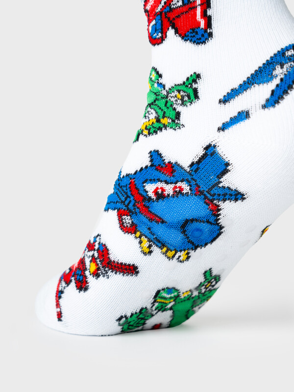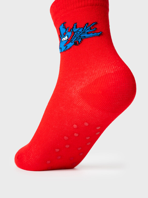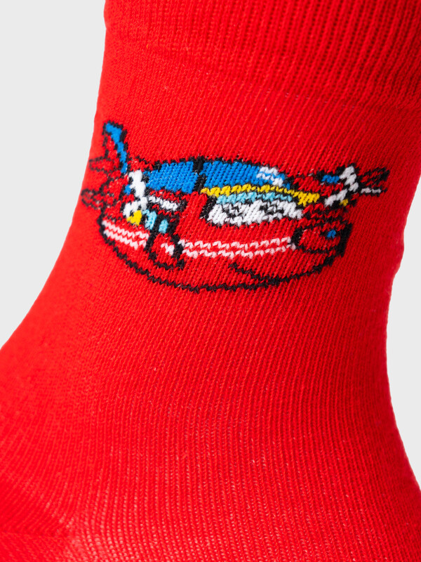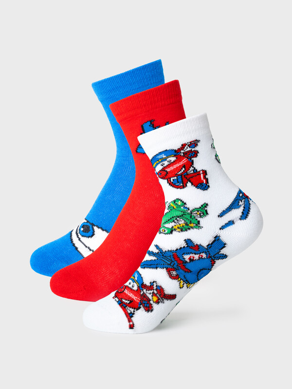 Набор детских носков с нескользящей подошвой для мальчика. Комплект из трёх пар детских носков. В комплекте три дизайна: белые с яркими принтами персонажей Super Wings, однотонные синие с мультяшным глазом и красные с небольшими вышивками самолётов. На подошве у всех носков есть силиконовые стопперы для безопасности. Удобный эластичный верх хорошо фиксирует носки, не сдавливая ногу. Размеры указаны на стопе. Материал — мягкий хлопковый трикотаж.