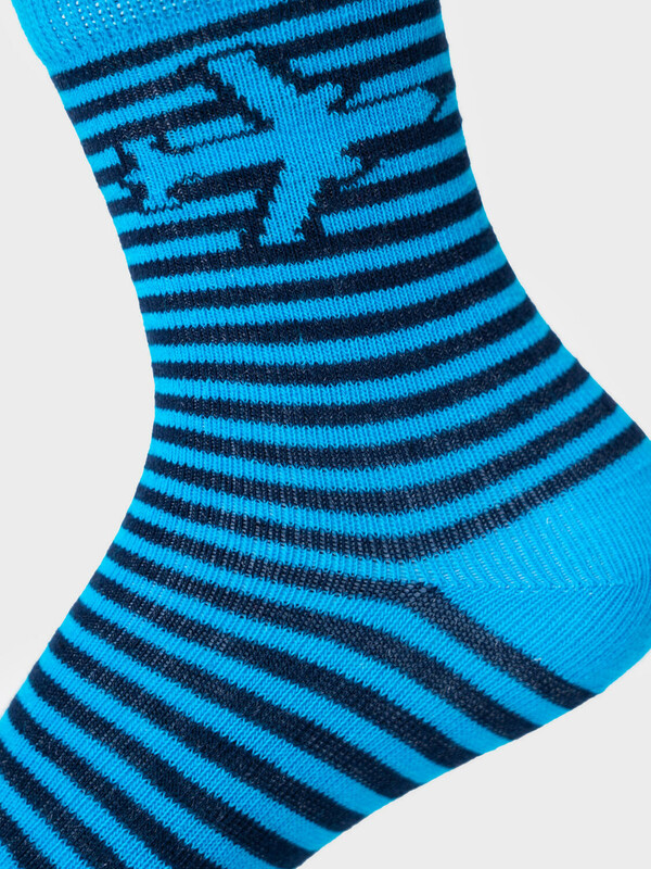 Набор из пяти пар детских носков для мальчика. В комплект входят модели с полосками, однотонные и с изображением самолёта. Удобная резинка не сдавливает ногу, а на стопе — аккуратная жаккардовая надпись с размером. Материал — мягкий хлопковый трикотаж.