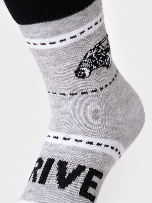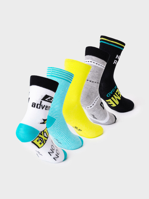 Набор из пяти пар детских носков для мальчика. В комплект входят модели с полосками, однотонные и с изображением машин. Удобная резинка не сдавливает ногу, а на стопе — аккуратная жаккардовая надпись с размером. Материал — мягкий хлопковый трикотаж.