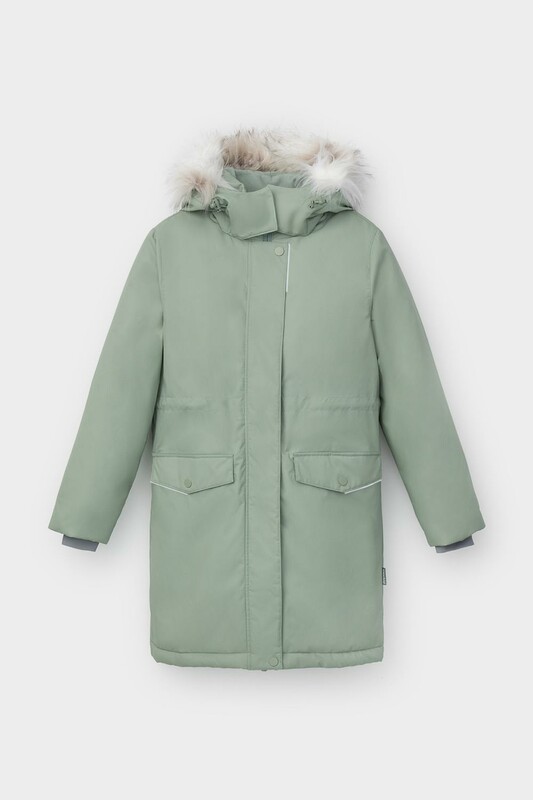 • Съемный капюшон на пилучках с отстегивающимся искусственным мехом
