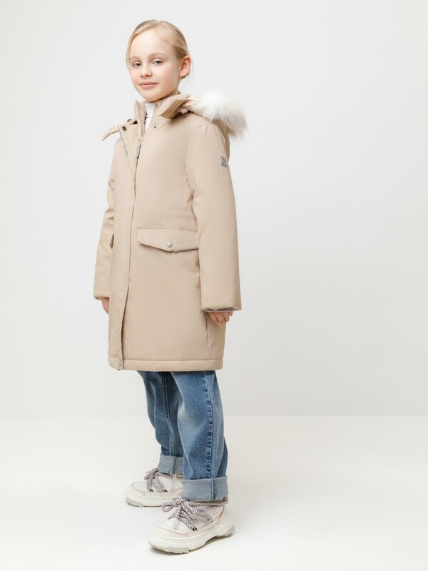 Зимнее пальто для девочки с утеплителем SEE®: 250 г/м2. Выполнено из мембранной ткани с дополнительной тефлоновой обработкой, которая предохраняет изделие от загрязнений и отталкивает влагу. Подклад выполнен из 100% полиэстера Tricot. Пальто застёгивается на молнию, предусмотрена защита подбородка. Съёмный капюшон на кнопках и липучках имеет отстёгивающийся искусственный мех. На рукавах мягкие манжеты. По бокам два кармана с клапанами, внутри карман на молнии. По талии эластичная утяжка со стопперами для регулировки ширины пальто. Во всех изделиях верхнего ассортимента для безопасности ребёнка предусмотрены светоотражающие элементы.