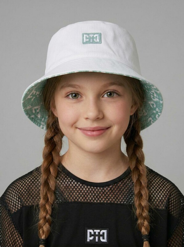 Двусторонняя панама для девочки подростка. С одной стороны она полностью покрыта светло-зелёным принтом с логотипами, а с другой — однотонная белая с небольшим логотипом по центру. Панама выполнена из лёгкой хлопковой текстильной ткани, идеально подходящей для тёплой погоды. Поля средней ширины, мягко ниспадают и аккуратно отстрочены.