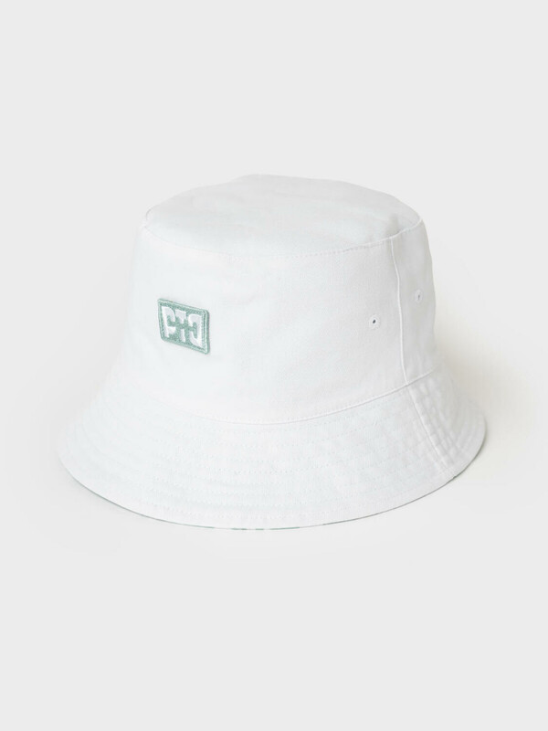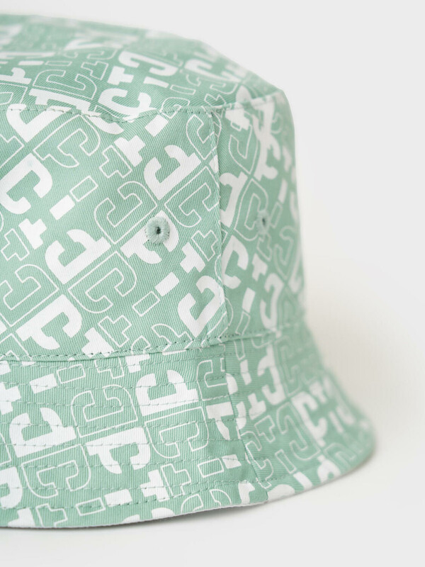 Двусторонняя детская панама для девочки. С одной стороны она полностью покрыта светло-зелёным принтом с логотипами, а с другой — однотонная белая с небольшим логотипом по центру. Панама выполнена из лёгкой хлопковой текстильной ткани, идеально подходящей для тёплой погоды. Поля средней ширины, мягко ниспадают и аккуратно отстрочены.