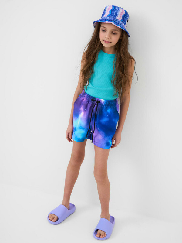 Детская панама для девочки. Изделие имеет классическую форму с широкими отстроченными полями и ярким принтом. По бокам сзади расположены два вентиляционных отверстия в виде вышитых люверсов.