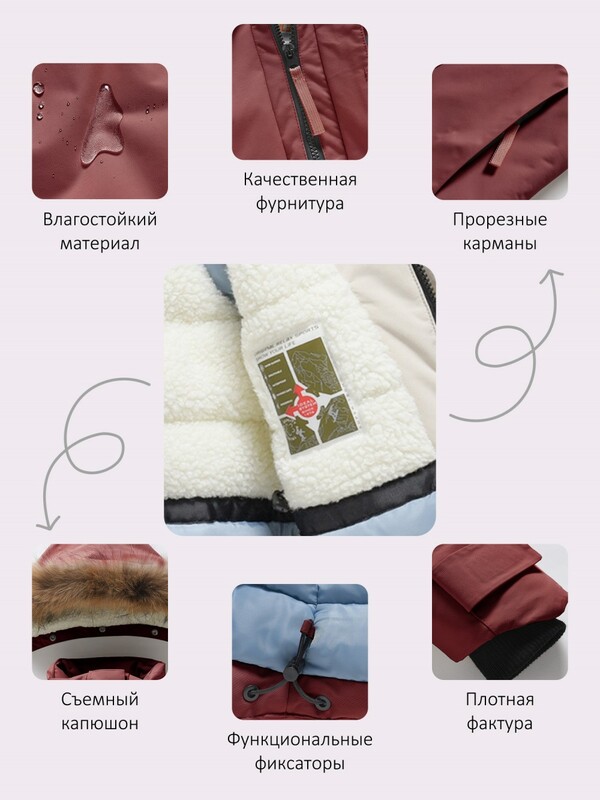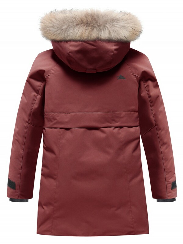 Капюшон с меховой отделкой надёжно защищает от ветра и снега, а фиксаторы на рукавах, по линии талии, на капюшоне и по низу парки помогают сохранить тепло и защитить ребёнка от продувания.