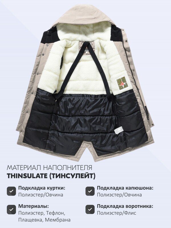 Зимняя парка для мальчика-подростка разработана с учётом всех требований к тёплой и практичной верхней одежде для холодного времени года. Свободный крой до колена обеспечивает удобство и свободу движений, модель одинаково комфортна как для школы, так и для повседневных прогулок. Верх выполнен из плотной износостойкой ткани с водоотталкивающими свойствами, а проклеенные швы надёжно защищают от ветра и влаги, сохраняя тепло внутри. Современный утеплитель тинсулейт с плотностью 280 г/м² поддерживает комфортный температурный режим и позволяет носить парку в диапазоне от +5 до –25 градусов.