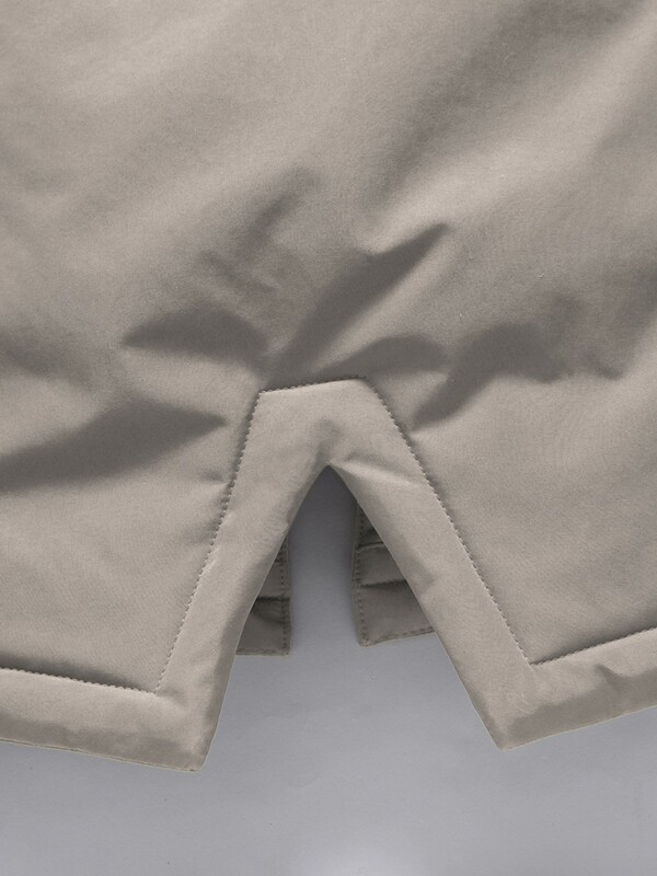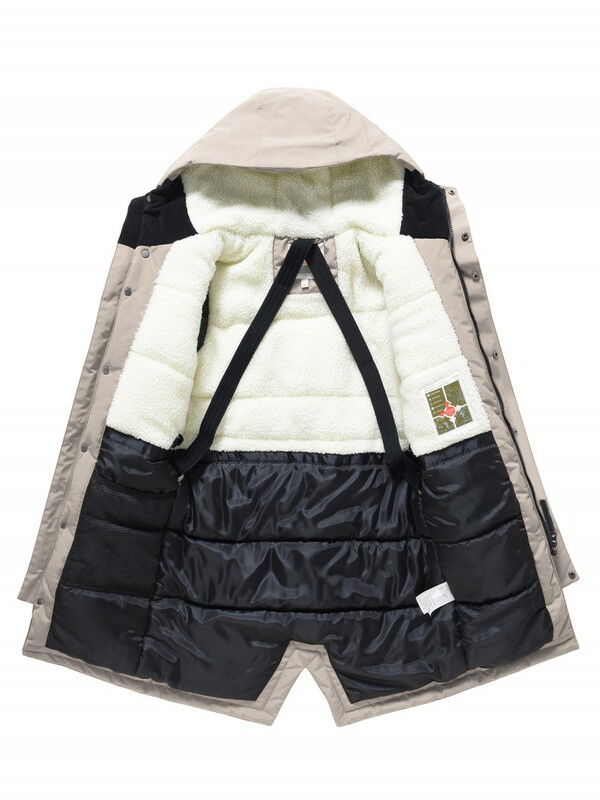 Внутренняя подкладка из овчины, полиэстера и флиса делает модель особенно уютной и приятной к телу. Капюшон несъёмный, он плотно прилегает и надёжно защищает голову в непогоду. Стояче-отложной воротник прикрывает шею и обеспечивает дополнительную защиту от ветра.