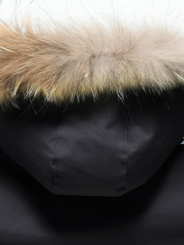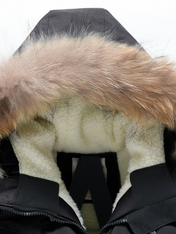 Внутренняя подкладка из овчины, полиэстера и флиса делает парку особенно уютной и приятной к телу. Тёплый капюшон с натуральным мехом енота надёжно защищает от снега и ветра, а опушка на молнии при желании легко снимается. Стояче-отложной воротник прикрывает шею и даёт дополнительную защиту в непогоду.