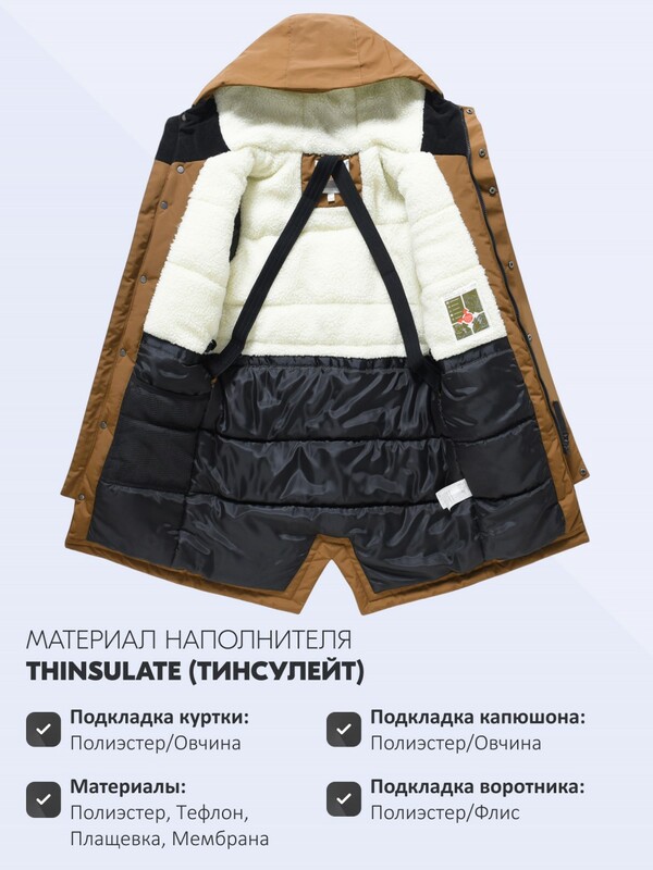 Зимняя парка для мальчика-подростка разработана с учётом всех требований к тёплой и практичной верхней одежде для холодного времени года. Свободный крой до колена обеспечивает удобство и свободу движений, модель одинаково комфортна как для школы, так и для повседневных прогулок. Верх выполнен из плотной износостойкой ткани с водоотталкивающими свойствами, а проклеенные швы надёжно защищают от ветра и влаги, сохраняя тепло внутри. Современный утеплитель тинсулейт с плотностью 280 г/м² поддерживает комфортный температурный режим и позволяет носить парку в диапазоне от +5 до –25 градусов.