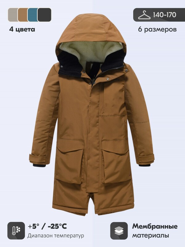 Эта парка представлена в стильных универсальных цветах — коричневом, тёмно-зелёном, чёрном и бежевом. Модель станет отличным выбором для родителей, которые ищут тёплую, удобную и долговечную зимнюю парку для мальчика-подростка, где сочетаются практичность, современный дизайн и комфорт.
