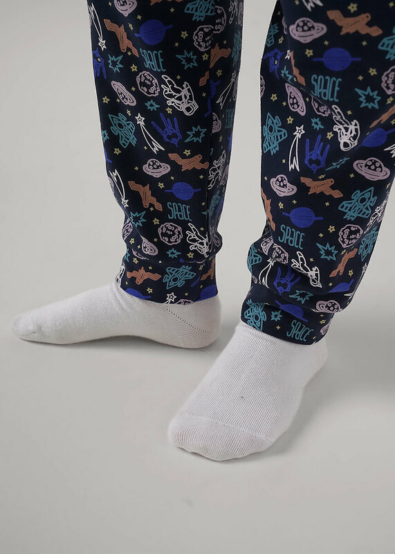 Комплект хлопковой пижамы из джемпера и брюк. Джемпер свободного кроя дополнен эластичной горловиной и манжетами. Брюки среднего объема, эластичный пояс обеспечит комфорт и идеальную посадку. По низу брюк эластичные манжеты.