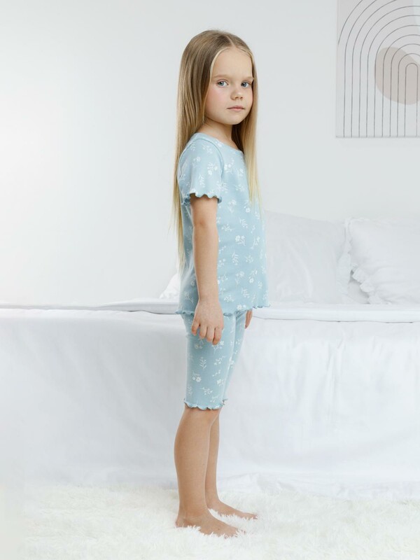 Трикотажная пижама в рубчик из натурального хлопка. Футболка с короткими втачными рукавами и шорты с эластичной резинкой в поясе. Оригинальная набивка выполнена из стойких текстильных гипоаллергенных красителей. Изделие сохраняет цвет и форму после многократных стирок. Все трикотажные полотна производятся в соответсвии с нормами швейцарского сертификата ЭкоТекс.