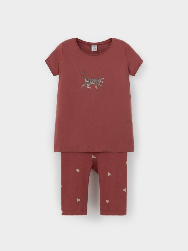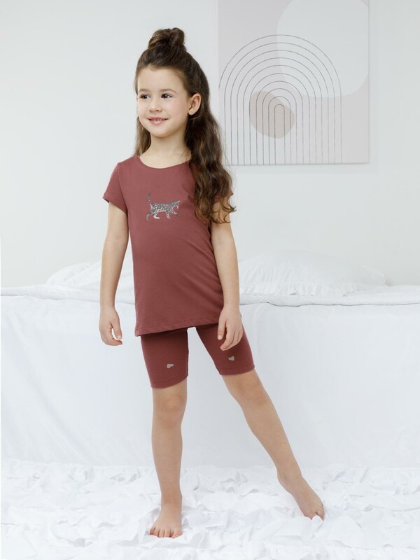Трикотажная пижама для девочки с футболкой и велосипедками. Футболка с короткими рукавами изготовлена из гладкого трикотажа супрем. Велосипедки с резинкой в поясе выполнены из эластичного материала в рубчик. Оригинальная набивка и принт выполнены из стойких текстильных гипоаллергенных красителей. Изделие сохраняет цвет и форму после многократных стирок. Все трикотажные полотна производятся в соответствии с нормами швейцарского сертификата ЭкоТекс.