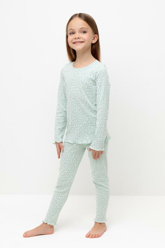 Трикотажная пижама в рубчик из натурального хлопка. Джемпер с длинными втачными рукавами и лосины с эластичной резинкой в поясе. Оригинальная набивка выполнена из стойких текстильных гипоаллергенных красителей. Изделие сохраняет цвет и форму после многократных стирок. Все трикотажные полотна производятся в соответсвии с нормами швейцарского сертификата ЭкоТекс.