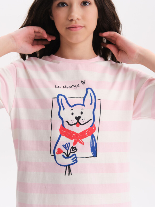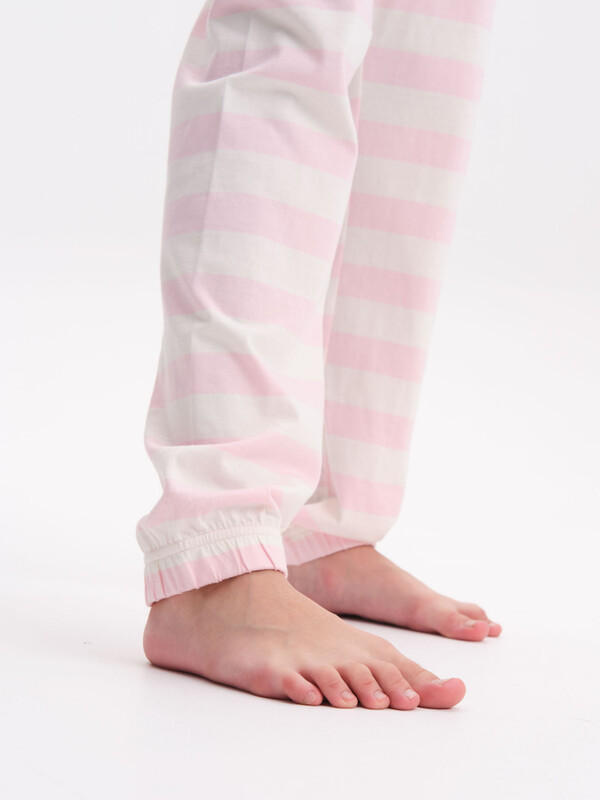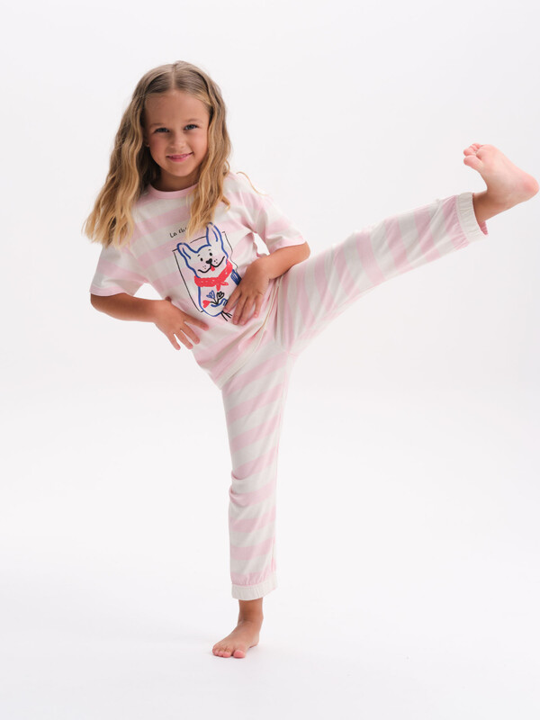 Стильная и уютная пижама актуального цвета для девочки. В составе ткани 100% хлопка — идеально для детской одежды! Модель приятна на ощупь, прекрасно пропускает воздух, позволяя коже ребёнка дышать. При этом в пижаме из хлопка ребёнку будет тепло, даже если он сбросит одеяло. Всё это обеспечивает комфортный и качественный сон. Футболка и брюки среднего объёма, плечо немного спущено, рукава широкие и свободные — в пижаме очень удобно спать. Широкая и мягкая резинка в поясе не перекручивается и не давит. Манжеты брюк и отделка горловины из эластичной рибаны — она не растягивается, ребёнку удобно надевать и снимать пижаму. Футболку украшает позитивный принт. Надпись переводятся: "шарж". Хлопковый комплект идеален для сна как дома, так и в детском саду — прекрасный выбор для вашего ребёнка! Пижама с брюками подходит для круглогодичного использования. Домашний комплект — замечательный подарок дочке, внучке, сестре на любой праздник. Выбирайте нужный размер по таблице размеров на фото. Цвет товара на экране вашего устройства может отличаться от цвета изделия вживую.