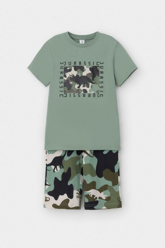 Трикотажная пижама из натурального хлопка. Футболка с короткими втачными рукавами и шорты с эластичной резинкой в поясе. Оригинальные набивка и принт выполнены из стойких гипоаллергенных текстильных гипоаллергенных красителей. Изделие сохраняет цвет и форму после многократных стирок. Все трикотажные полотна производятся в соответсвии с нормами швейцарского сертификата ЭкоТекс.