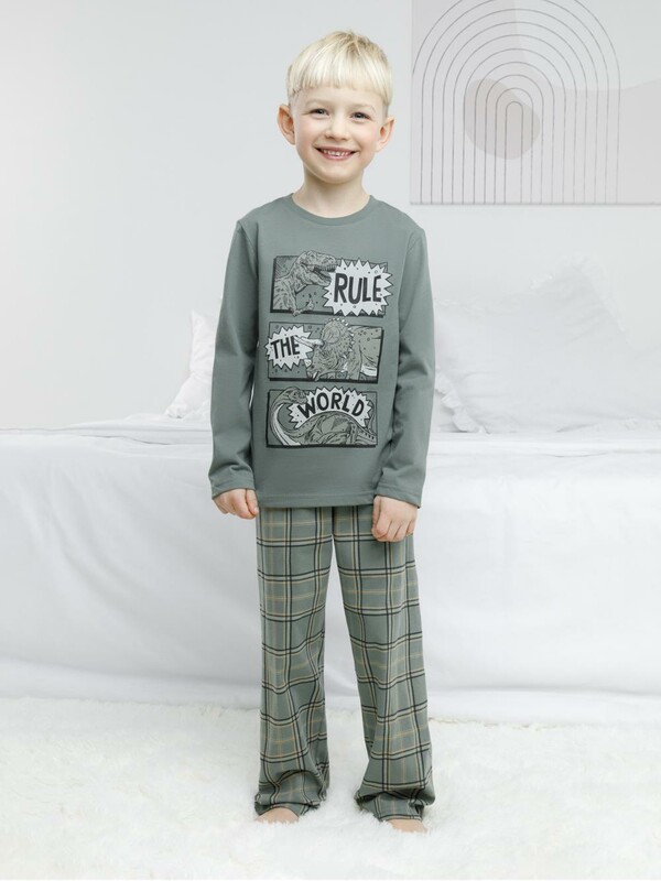Пижама для мальчика из натурального хлопка. Джемпер с длинными втачными рукавами и прямые брюки с эластичной резинкой в поясе. Оригинальная набивка и принт выполнены из стойких текстильных гипоаллергенных красителей. Изделие сохраняет цвет и форму после многократных стирок. Все трикотажные полотна производятся в соответствии с нормами швейцарского сертификата ЭкоТекс.