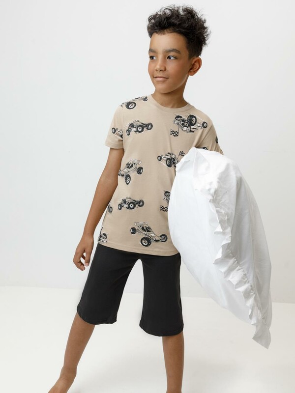 Трикотажная пижама из натурального хлопка. Футболка с короткими втачными рукавами и шорты с эластичной резинкой в поясе. Оригинальная набивка выполнена из стойких гипоаллергенных текстильных гипоаллергенных красителей. Изделие сохраняет цвет и форму после многократных стирок. Все трикотажные полотна производятся в соответсвии с нормами швейцарского сертификата ЭкоТекс.