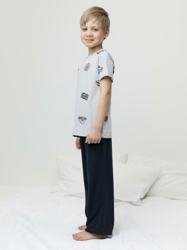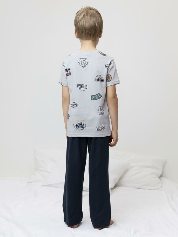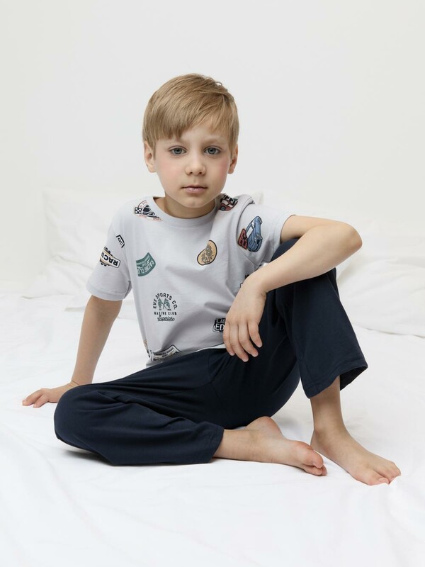 Пижама для мальчика из натурального хлопка. Футболка с короткими втачными рукавами и прямые брюки с эластичной резинкой в поясе. Оригинальная набивка выполнена из стойких текстильных гипоаллергенных красителей. Изделие сохраняет цвет и форму после многократных стирок. Все трикотажные полотна производятся в соответствии с нормами швейцарского сертификата ЭкоТекс.