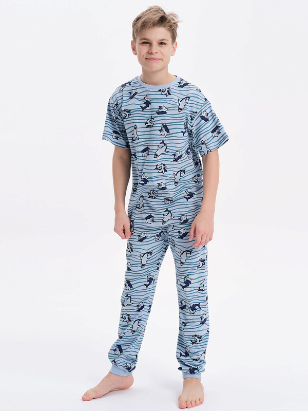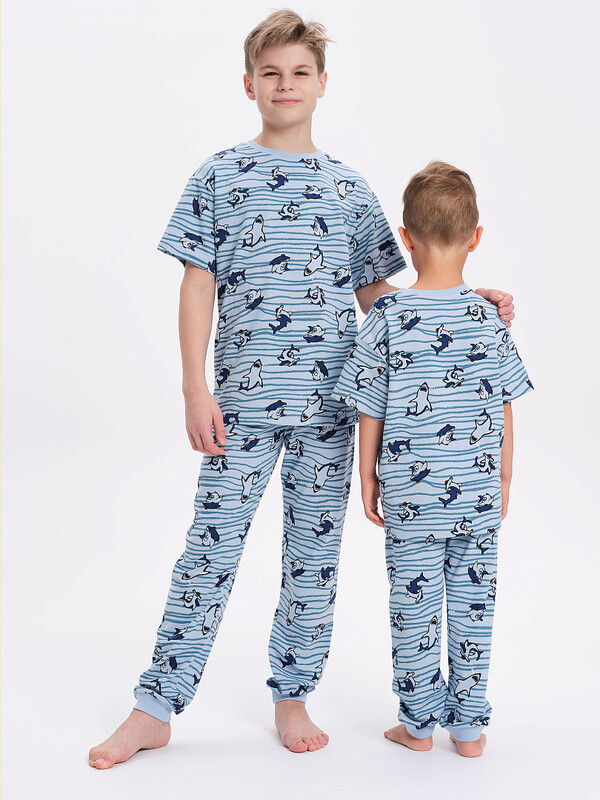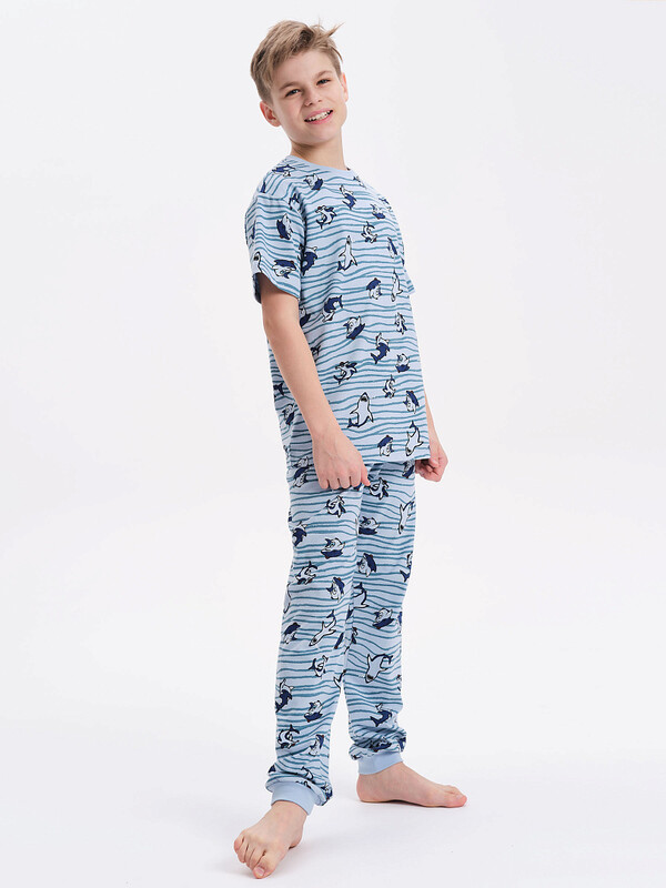 Уютная пижама для мальчика. Изделие выполнено из 100% хлопка — идеальный вариант для детской пижамы. Ткань из хлопка приятна на ощупь и превосходно пропускает воздух, позволяя коже ребёнка дышать. В пижаме из хлопка ребёнку будет комфортно, даже если он сбросит одеяло. Футболка и брюки умеренного объёма, рукава свободные — пижама очень удобна для сна. В поясе брюк мягкая и широкая резинка — не перекручивается и не давит. Манжеты брюк и отделка горловины джемпера из эластичной рибаны — комплект удобно надевать и снимать. А также резинка отлично сохраняет форму в течение долгого времени. Пижама выполнена в all-over принт в морской тематике. Принт мягкий и эластичный, отлично переносит многочисленные стирки. Комплект подходит для сна как дома, так и в детском саду — прекрасный выбор для вашего ребёнка!