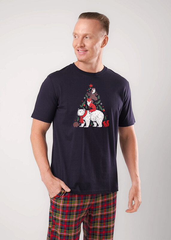 Набор мужской состоящий из футболки и брюк. Футболка из хлопковой кулирной глади с коротким рукавом , спереди авторский принт. Брюки из клетчатой кулирной глади с карбоном на широком поясе с резинкой и шнуром, по бокам удобные карманы.