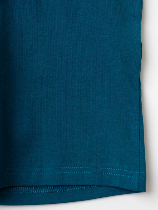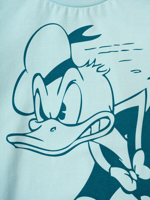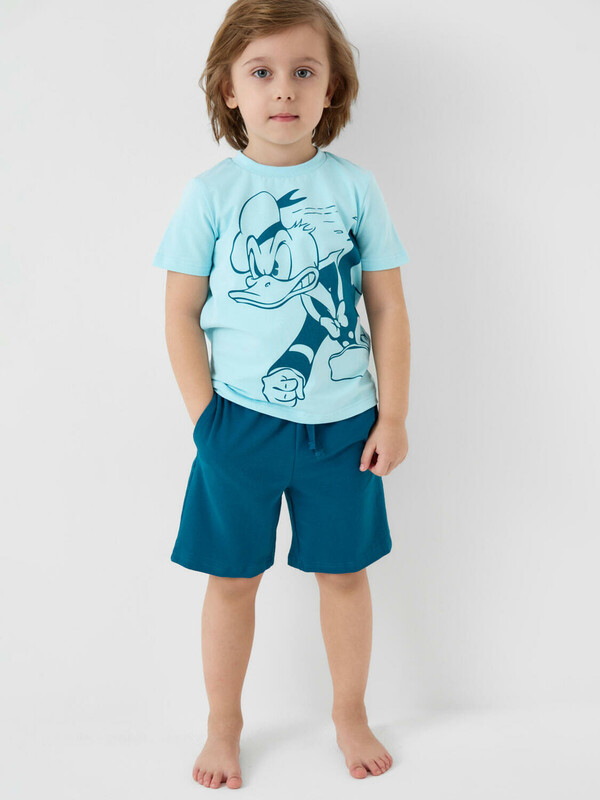 Пижама детская для мальчика. Комплект состоит из футболки, прямого кроя с короткими рукавами и шорт. На футболке яркий и крупный принт с Дональдом Даком. Шорты оснащены удобным эластичным поясом с шнурком для регулировки. Есть боковые карманы. Материал — мягкий и комфортный хлопковый трикотаж.