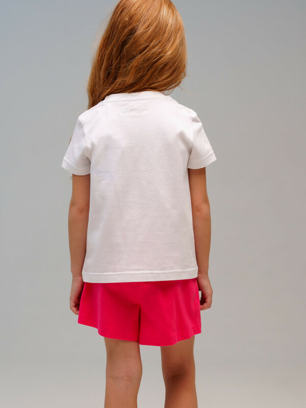 Пижама детская для девочки. Футболка и шорты из эластичного и приятного на ощупь трикотажа. Шорты на резинке со шнурком. Высокое содержание хлопка 95%. Благодаря наличию эластана в составе ткани изделие держит форму и меньше мнется. Модель выполнена из качественного и приятного на ощупь трикотажа.