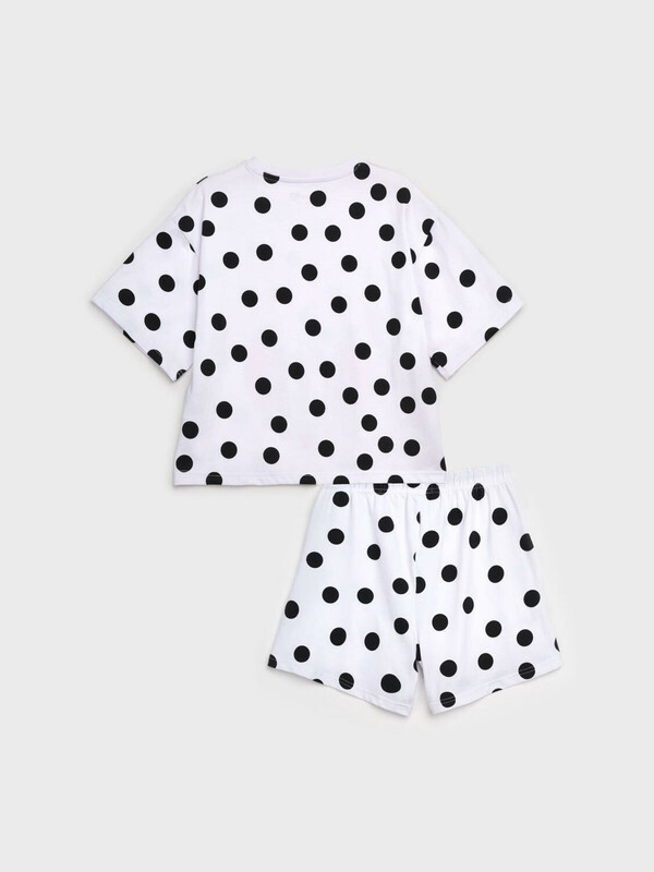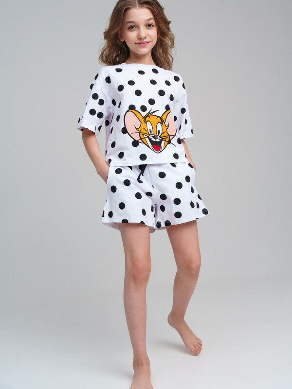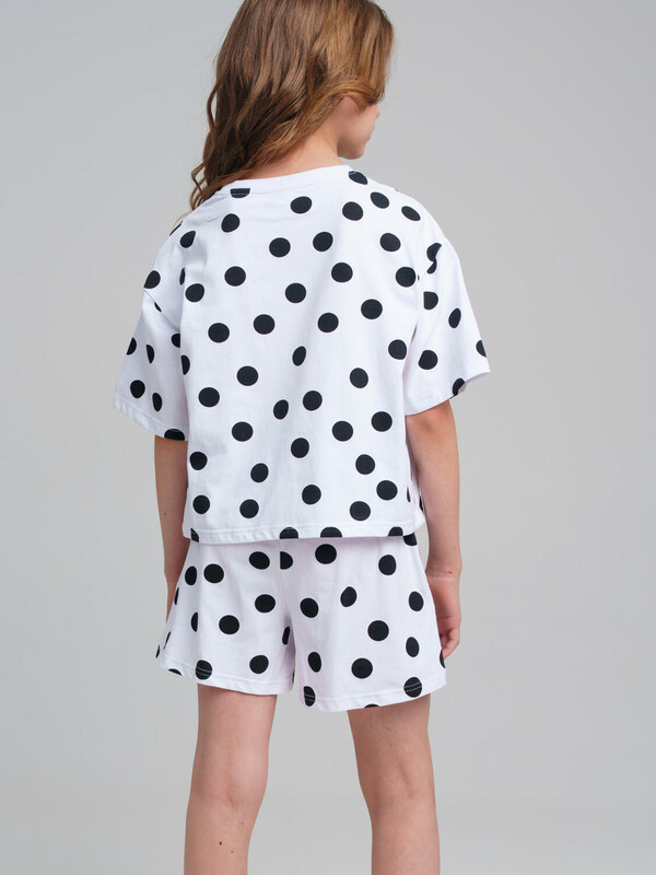 Пижама для девочки подростка. Футболка и шорты из эластичного и приятного на ощупь трикотажа. Шорты на резинке со шнурком. Высокое содержание хлопка 95%. Благодаря наличию эластана в составе ткани изделие держит форму и меньше мнется.