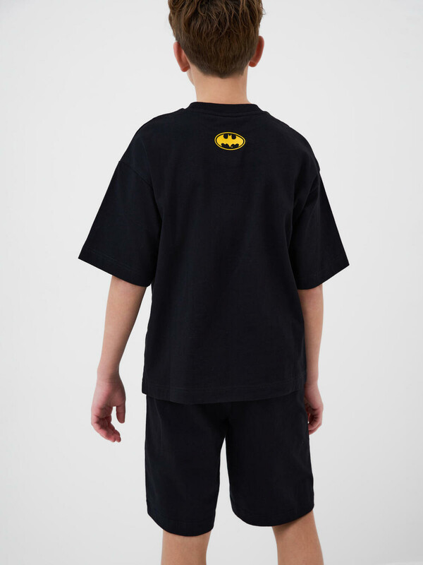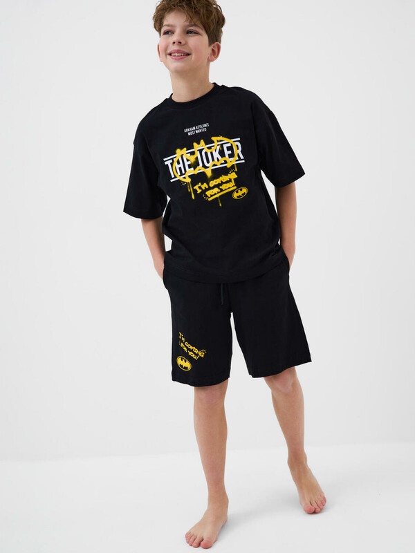 Пижама для мальчика подростка. Состоит из чёрной оверсайз футболки и шорт. На футболке — яркий лицензионный принт с Batman. Пояс на резинке со шнурком, по бокам — удобные карманы. Модель выполнена из мягкого, хлопкового трикотажа.