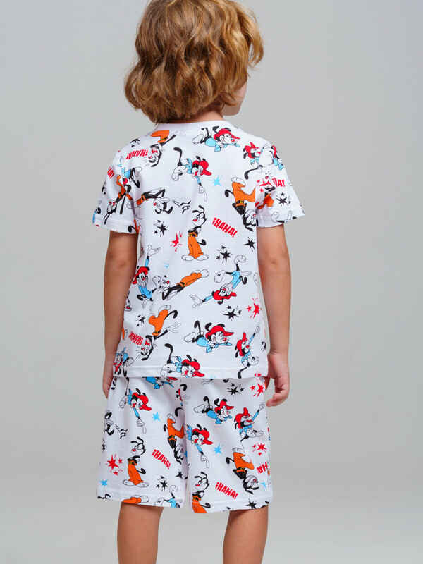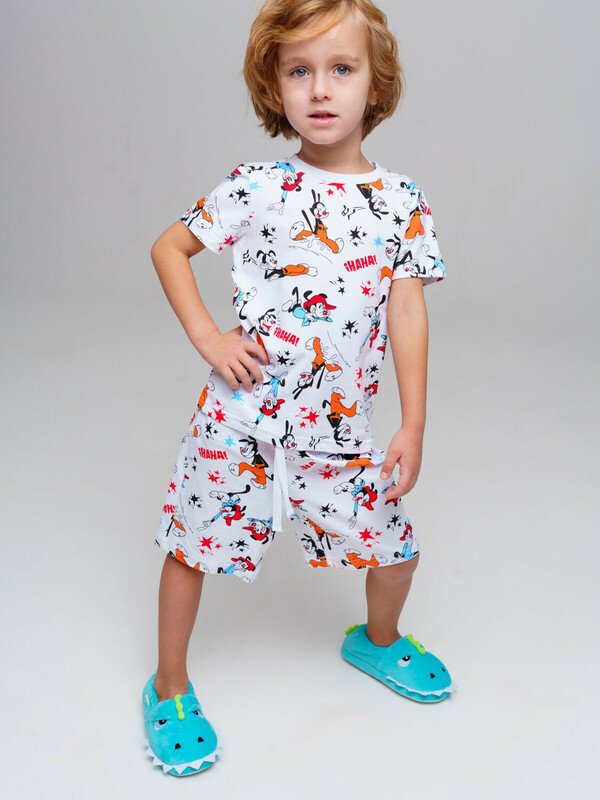 Пижама детская для мальчика. Футболка и шорты из эластичного и приятного на ощупь трикотажа. Шорты на резинке со шнурком. Высокое содержание хлопка 95%. Благодаря наличию эластана в составе ткани изделие держит форму и меньше мнется.