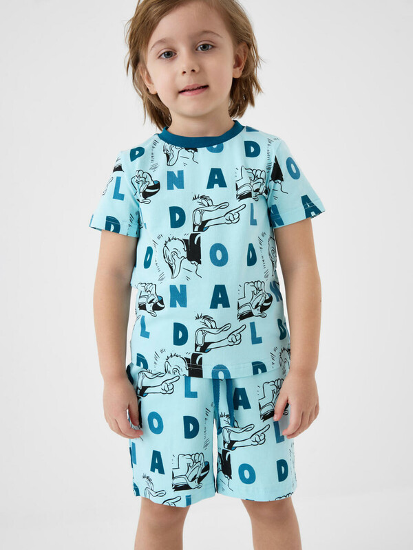 Детская пижама для мальчика. Комплект состоит из футболки, прямого кроя с короткими рукавами и шортов. Материал — мягкий хлопковый трикотаж с ярким принтом. Футболка с круглым вырезом и удобной горловиной из риба. Шорты на мягкой резинке и со шнурком для регулировки. Боковые карманы.