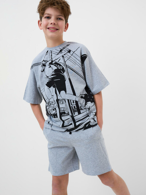 Пижама для мальчика подростка. Состоит из серой футболки оверсайз с короткими рукавами и серых шорт. Материал - хлопковый трикотаж. На футболке спереди нанесён яркий принт с изображением скейтера в движении. Вырез горловины круглый, с эластичной резинкой. Шорты свободного кроя, с боковыми карманами и эластичным поясом. Пояс дополнен шнуром.