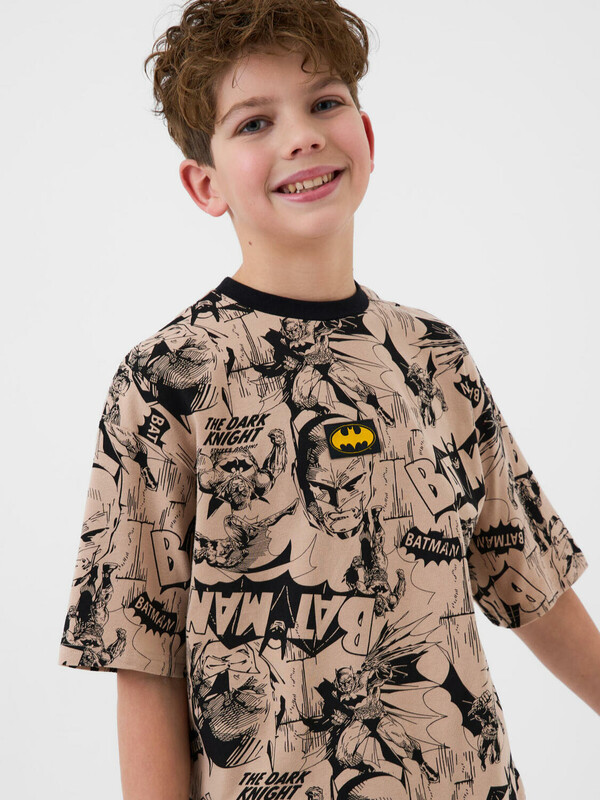 Пижама для мальчика подростка. Комплект состоит из оверсайз футболки с коротким рукавом и брюк. Изделие выполнено из мягкого, хлопкового трикотажа с ярким и насыщенным принтом в стиле комиксов про Бэтмена. На груди футболки размещён узнаваемый жёлтый логотип героя. Пояс брюк на резинке с дополнительным внутренним шнуром для регулировки. Боковые карманы.