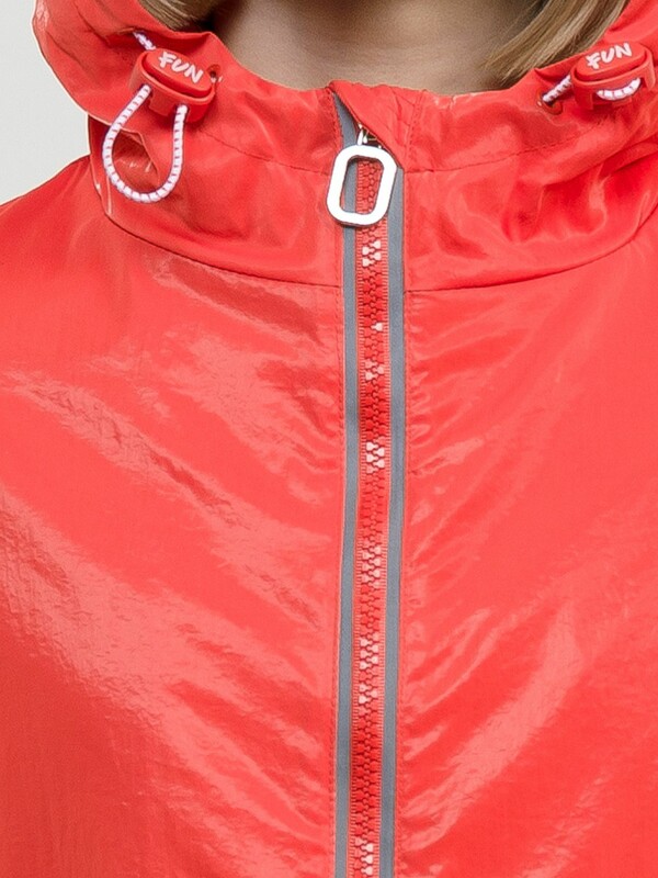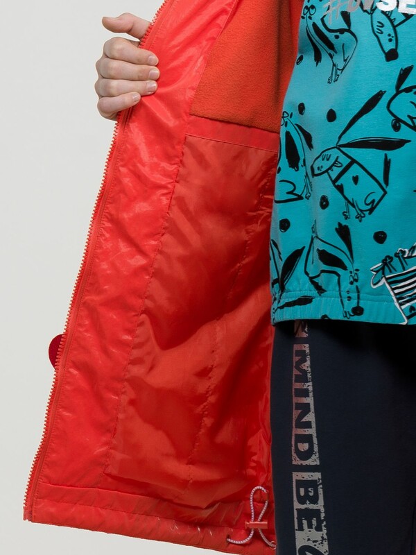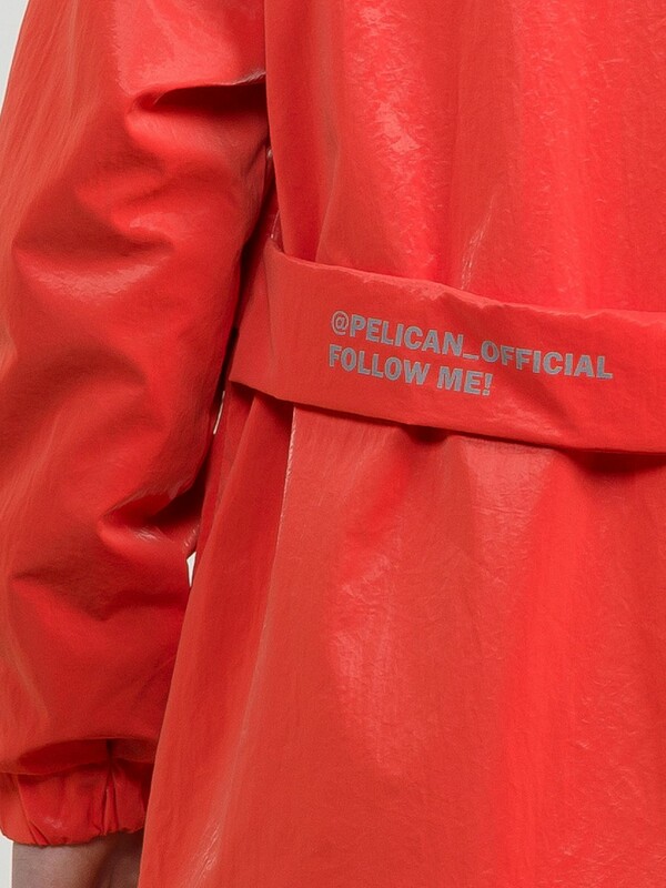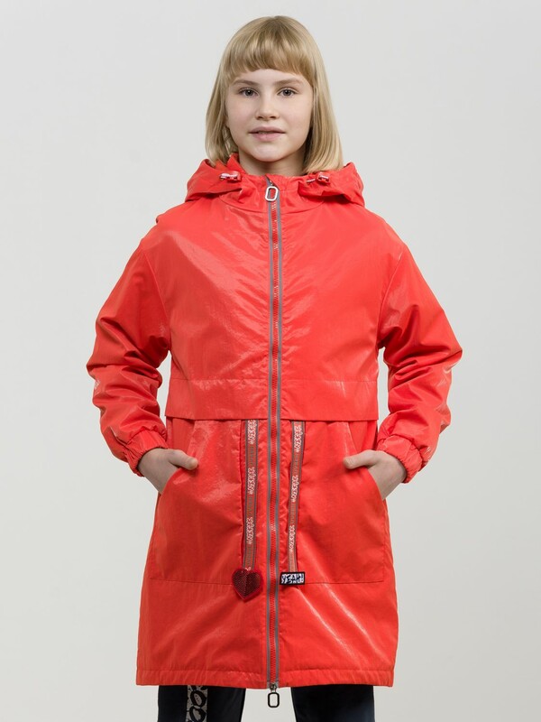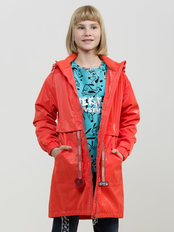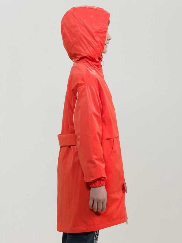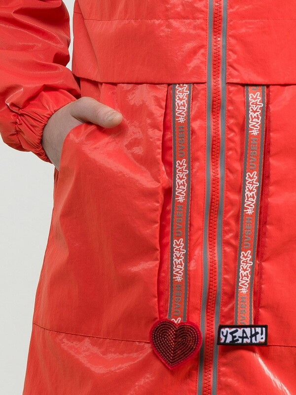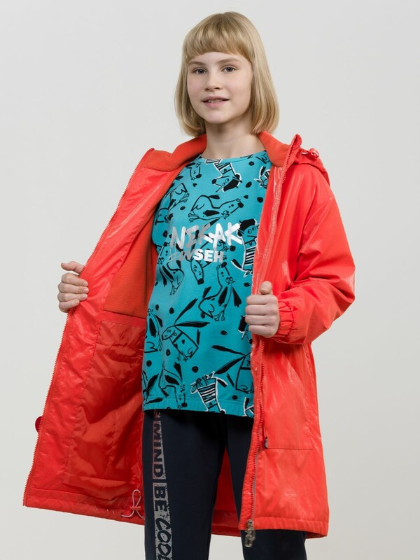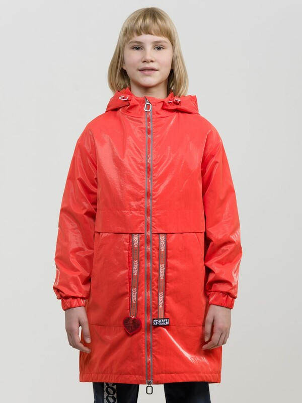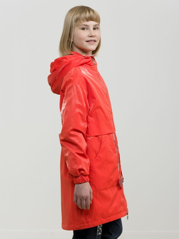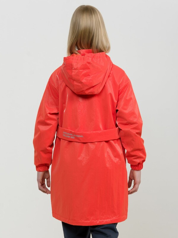 Утепленный плащ синтепон 40 г/м2 в рукавах, подклад из флиса в капюшоне, по стану и на внутреннем воротнике. Рекомендуемый температурный режим не ниже плюс 5 градусов. Силиконизированная ткань крэш с благородным матовым блеском. Водоотталкивающее покрытие. Прямой силуэт, по переду с декоративным горизонтальным членением чуть выше талии и легким плавным перепадом длин по низу изделия. Двухшовный неотстегивающийся капюшон с регулировкой объема, переходящий в воротник стойку. Изюминка большие накладные карманы и две принтованные репсовые ленты с оригинальными наконечниками, один из которых декорирован пайетками. По спинке широкий отлетной пояс со световозвращающим принтом, перевод Следуй за мной. Световозвращающие элементы вдоль застежки молнии.