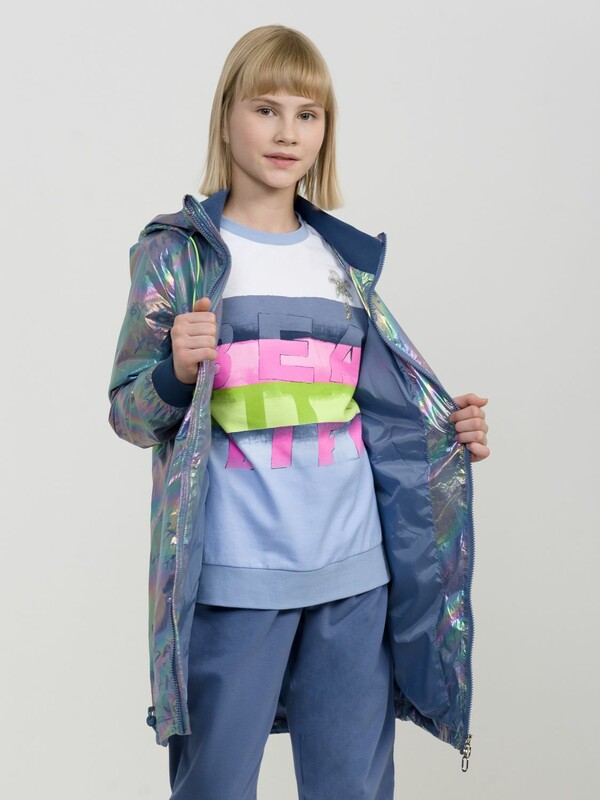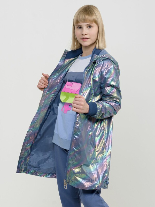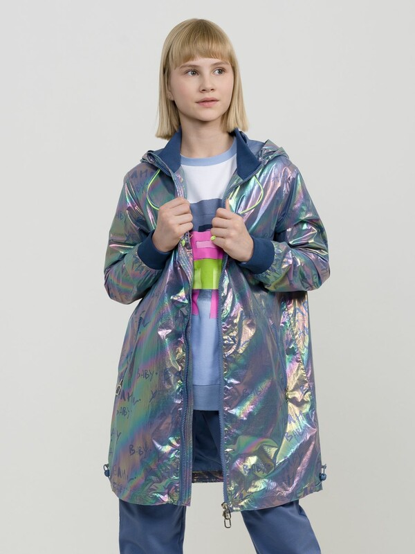 Плащ на тонком подкладе. Рекомендуемый температурный режим не ниже плюс 10 градусов. Ткань с голографическим водоотталкивающим покрытием. Прямой силуэт с регулировкой понизу эластиком со стоппером. Внутренний воротник и манжеты рукавов из рибаны. Оригинальная конструкция капюшона вместо классической утяжки по краю капюшона на шнур с фиксатором спроектирована специальная деталь держатель для декоративной тесьмы, которая регулирует объем капюшона по внешнему краю двойным эластиком с прозрачным наконечником. Световозвращающие элементы в боковых швах.
