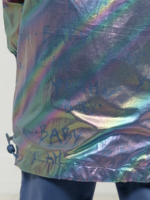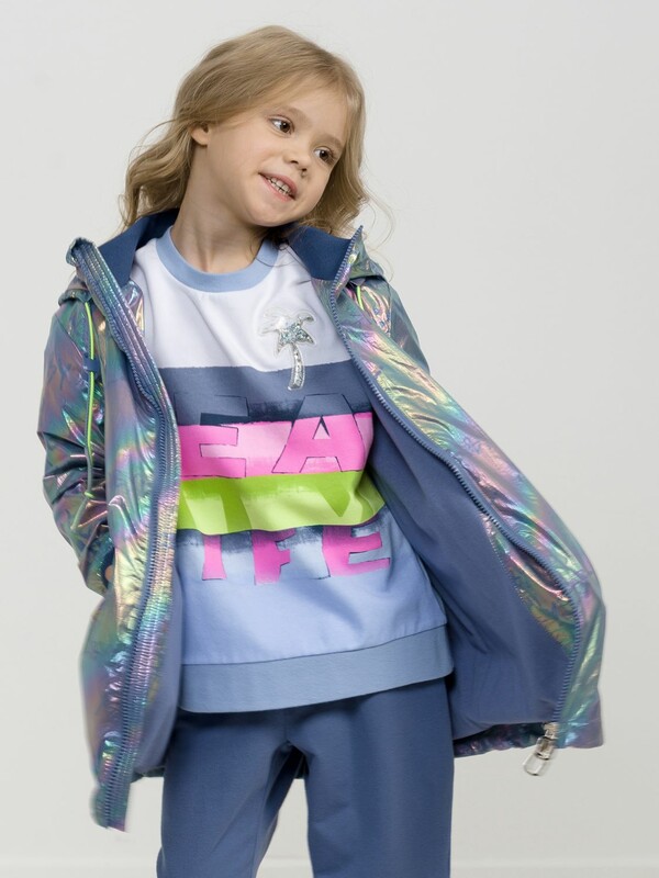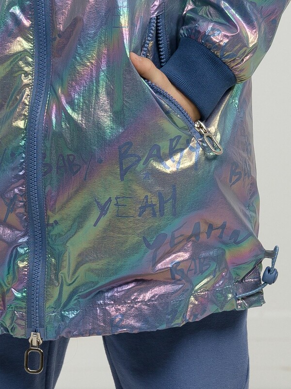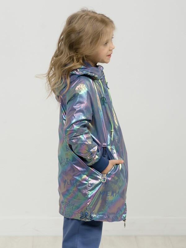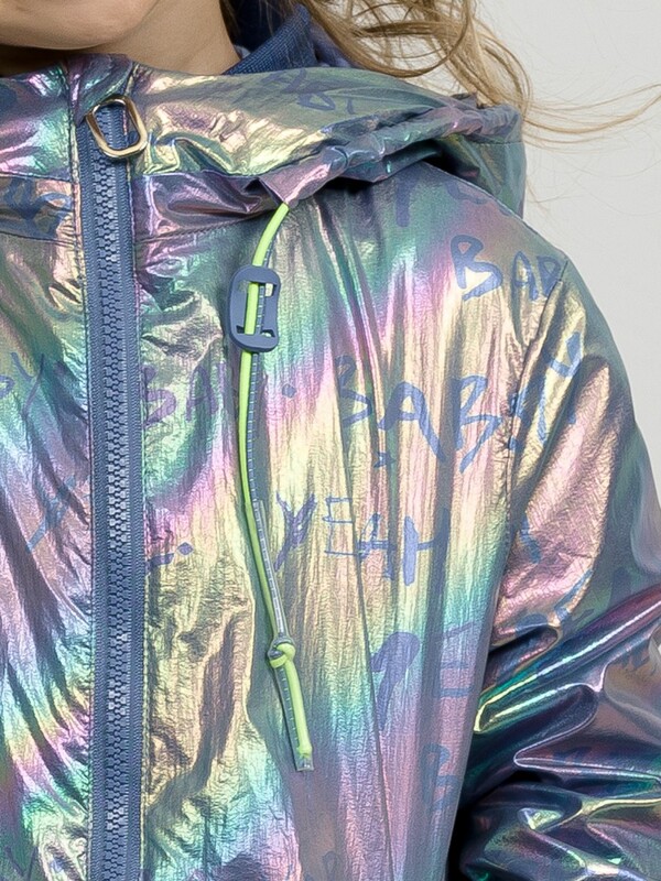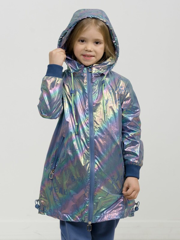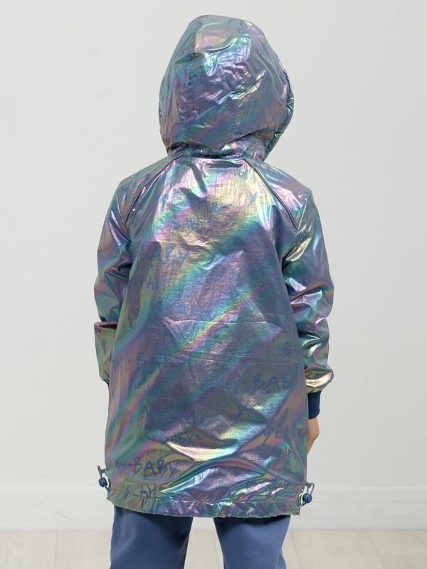 Плащ на тонком подкладе. Рекомендуемый температурный режим не ниже плюс 10 градусов. Ткань с голографическим водоотталкивающим покрытием. Прямой силуэт с регулировкой понизу эластиком со стоппером. Внутренний воротник и манжеты рукавов из рибаны. Оригинальная конструкция капюшона вместо классической утяжки по краю капюшона на шнур с фиксатором спроектирована специальная деталь держатель для декоративной тесьмы, которая регулирует объем капюшона по внешнему краю двойным эластиком с прозрачным наконечником. Световозвращающие элементы в боковых швах.