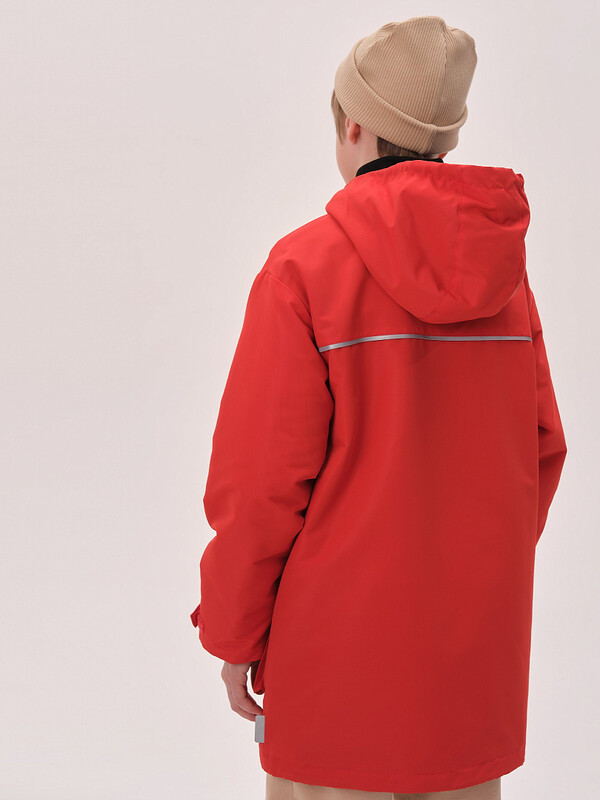 Плащ для мальчика имеет внутреннюю регулировку объёма изделия эластичным шнуром по низу, что обеспечивает идеальную посадку и защиту от ветра. Объём рукавов легко регулировать благодаря патам-липучкам на низу. Светоотражающие элементы в боковых швах и по центру спинки гарантируют видимость в темное время суток.