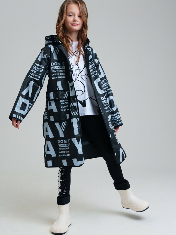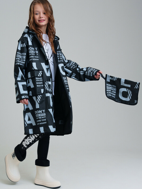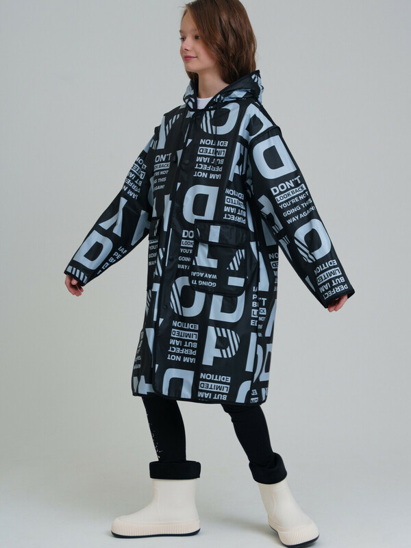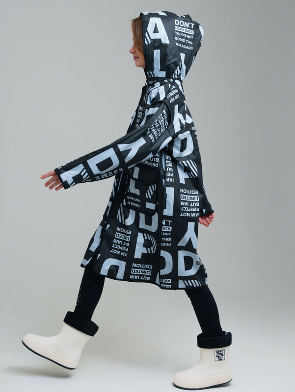 Плащ-дождевик для девочки-подростка с принтом в коллекцию. Капюшон с утяжкой. Застежка на кнопки. Материал ЭВА. Без подкладки. Модель имеет спереди два накладных кармана с клапаном. Добавлена петелька под капюшоном с внешней стороны, чтобы остальные вещи на вешалке не намокали. Сзади есть светоотражающая полоска. Идеально подходит для парного образа мама-дочь, так как такая модель есть в размерах для взрослых. В комплекте идет непромокаемая сумочка.